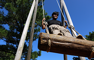 亜熱帯の森の中で大空へと弧を描く、大きなブランコの遊具エリアです。風を切る音、